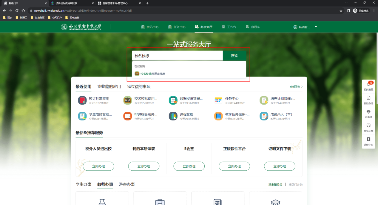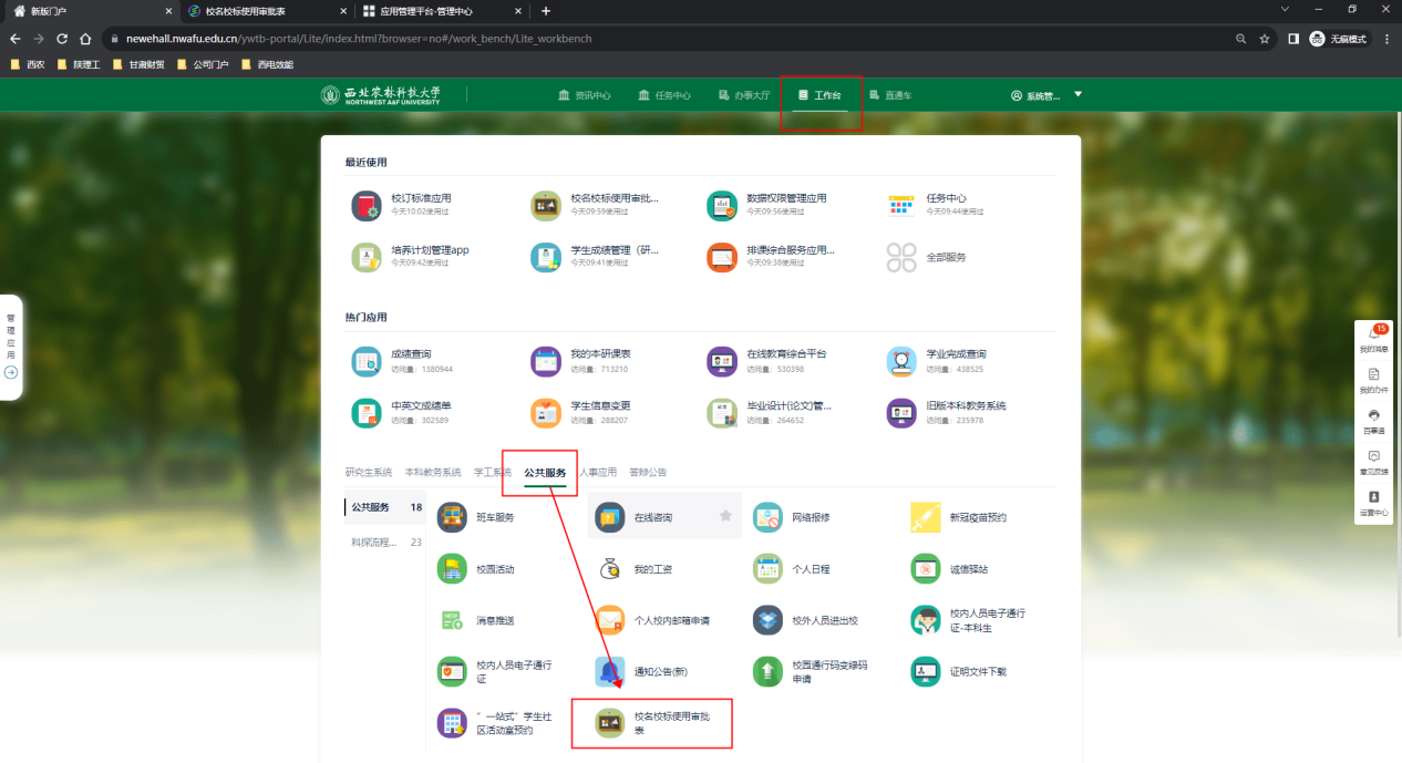 或在工作台页面公共服务查找“校名校标使用审批表”应用点击进入