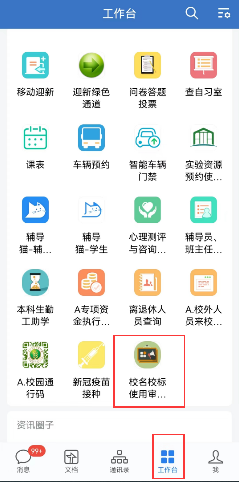 2.手机端在学校企业微信工作台中查找“校名校标使用审批表”,点击进入应用