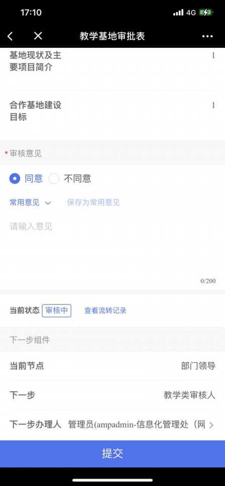 审核人可以查看申请人填写的信息,若填写信息无误,审核意见选择“同意”,流转到下一步审核人,若填写信息有误,审核意见选择“不同意”可返回至申请人。
