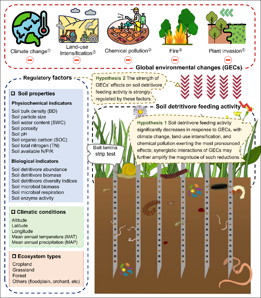 长期以来,关于全球环境变化(涵盖气候变化、土地利用集约化、化学污染、火灾、植物入侵五大类驱动因子)对土壤动物影响的研究,多聚焦于物种多样性与群落结构层面,而针对其核心功能(尤其是取食活性)的全球尺度系统解析尚属空白,导致学界难以精准评估地下生态系统的功能风险。为此,该研究首先构建了清晰的概念框架(图1),系统厘清了全球环境变化驱动因子、调控因素(土壤属性、气候条件、生态系统类型等)与土壤食碎屑动物取食活性、生态系统功能之间的内在关联,明确了“驱动因子-调控因素-功能响应”的完整逻辑链条。在此基础上,研究团队整合全球55项独立研究的650组观测数据(覆盖61个全球分布式研究站点),开展了跨生态系统、多驱动因子的整合分析。