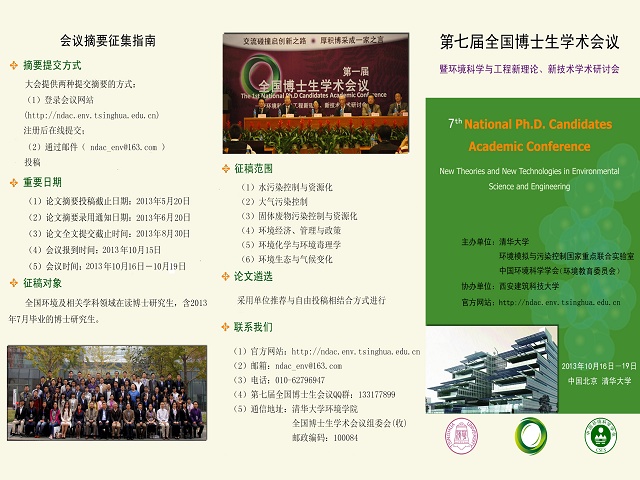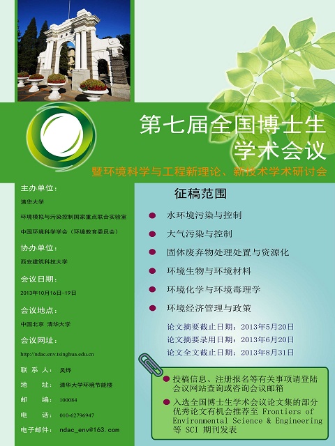 由清华大学、中国环境科学学会(环境教育委员会)和环境模拟与污染控制国家重点联合实验室主办、西安建筑科技大学协办的第六届全国博士生学术会议暨环境科学与工程新理论、新技术研讨会的摘要投稿截止日期为2013年5月20日,希望有意投稿的同学登录会议官方网站http://ndac.env.tsinghua.edu.cn了解具体投稿事宜。投稿方式主要为网站在线提交。