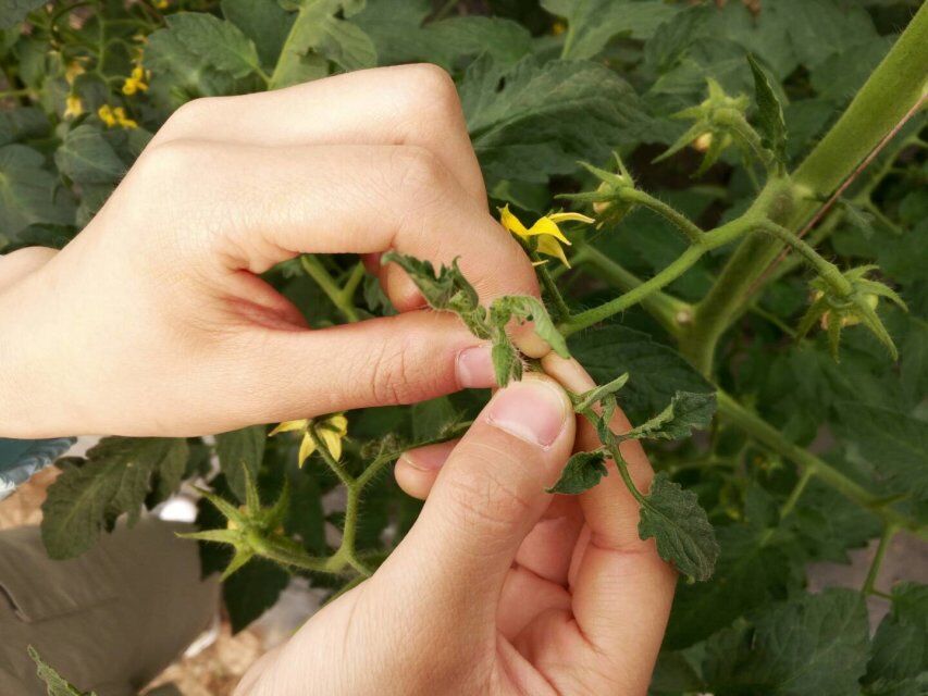 完成吊秧工作后,队员们进行第二项工作——番茄的吊秧和打尖。打尖在生物学上称为去除顶端优势,能合理的调节作物植株内营养物质的分配和运输,使植物的侧芽和果枝长得更茂盛,提高结实率。掐尖是个技术活,要判断哪些可以掐哪些不可以,对于主干来说,如果超过一人高,顶端无小花或者小花长得足够大,掐尖,若未超过一人高,则不掐;对于侧枝来说,不用管高度,判断标准和主干一样。理论懂得,实际操作起来却并没那么容易,判断起来还是很困难。队伍通过这件事,明白一个道理——课堂上学到的知识要和实际生活相联系,理论必须要联系实际,实践出真知。