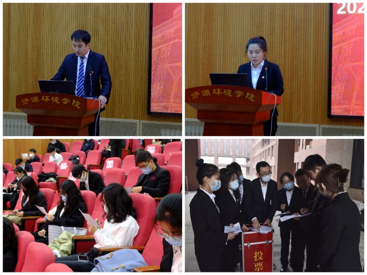 会议第一阶段,王树森、陆可心分别代表经济管理学院研究生会和校研究生会致辞,并向大会的召开表示祝贺。资源环境学院团委书记张浩然发表重要讲话。资源环境学院团委书记张浩然对过去一年的工作予以肯定,并希望新一届研会骨干成员们认真贯彻落实党的基本理论、方针、政策,与时俱进,团结带领广大学生听党话、跟党走,坚持不忘初心、牢记使命,在推进中国特色社会主义伟大事业中不断开创研究生会工作新局面。
