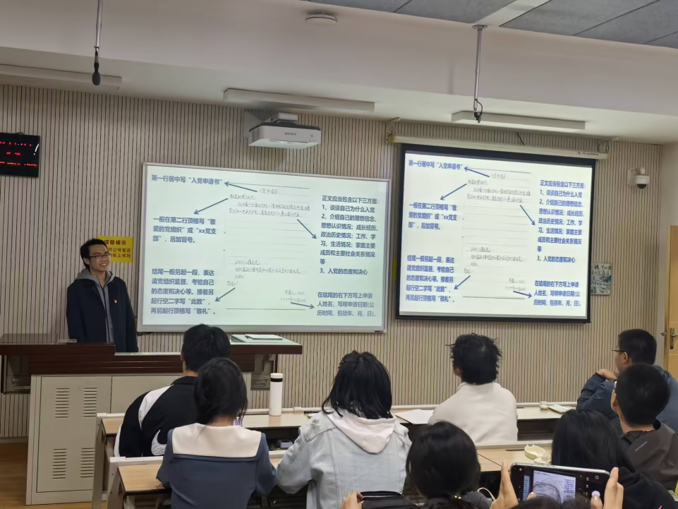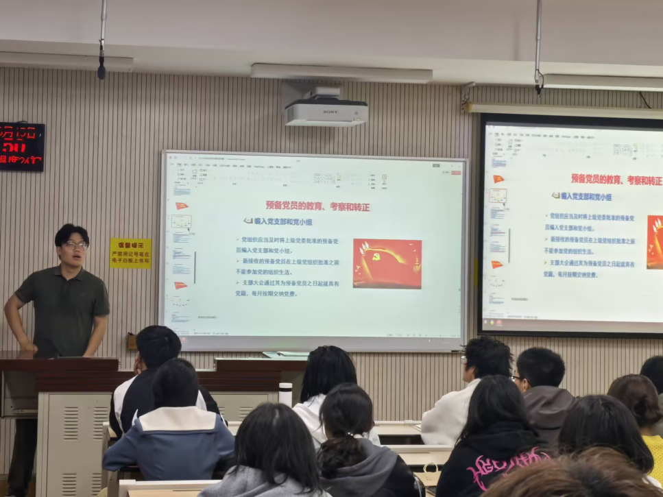 张圣同学为大家系统介绍了发展党员工作程序的五个阶段:首先介绍了申请入党和入党积极分子的确定和培养教育阶段,详细向大家说明了入党申请书的规范和入党积极分子的推选方式;随后介绍了发展对象的确定和考察、预备党员的接收以及预备党员的教育考察和转正三个阶段,着重为大家说明了发展对象的推选方法和接收为预备党员的具体要求和注意事项。在宣讲过程中,张圣同学与25级的同学进行互动交流,对同学提出的问题进行了耐心解答,并结合自身经历,为同学们提出建议,鼓励大家从各个方面提升自己的能力,并加强自身对党的知识和历史的学习。
